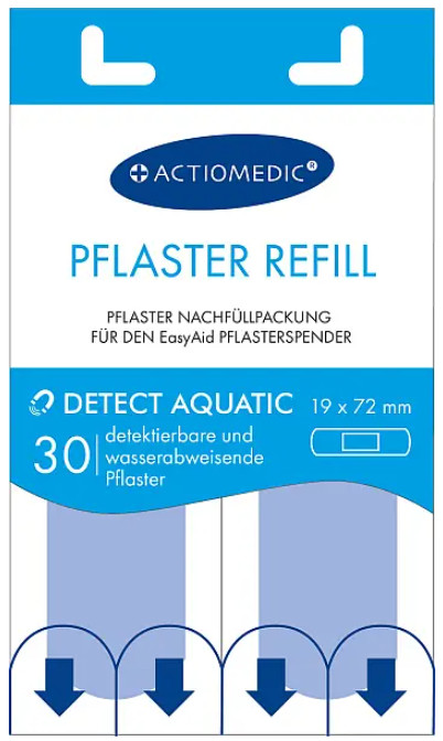 Az Actiomedic EasyAid DETECT AQUATIC sebtapasz utántöltő vízálló sebtapaszokat kínál, így ideális irodákba, sportlétesítményekbe és közösségi helyekre.