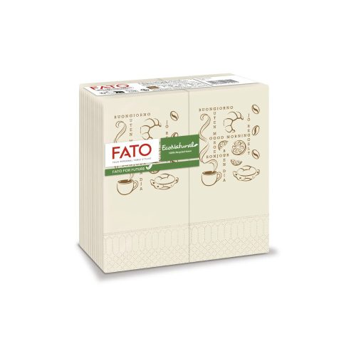 A szalvéta Fiberpack® technológiával készül, amely újrahasznosított italos kartondobozokból (pl. Tetra Pak) kinyert cellulózt használ, ezzel támogatva a körforgásos gazdaságot és jelentősen csökkentve a környezeti terhelést. A szalvéta természetes barna színe nem festett vagy fehérített – ez a szín az alapanyag valódi árnyalata, ami hiteles és esztétikus megjelenést ad a terítéknek.