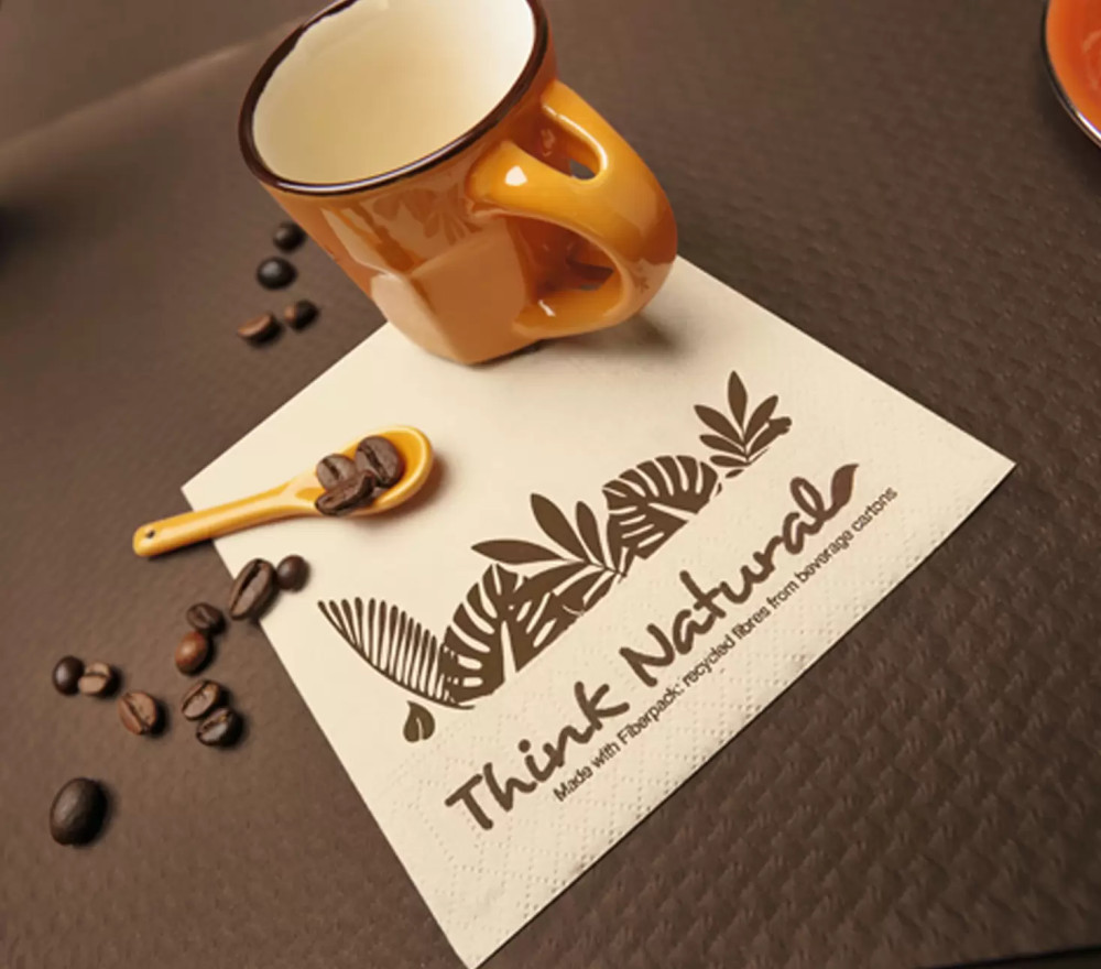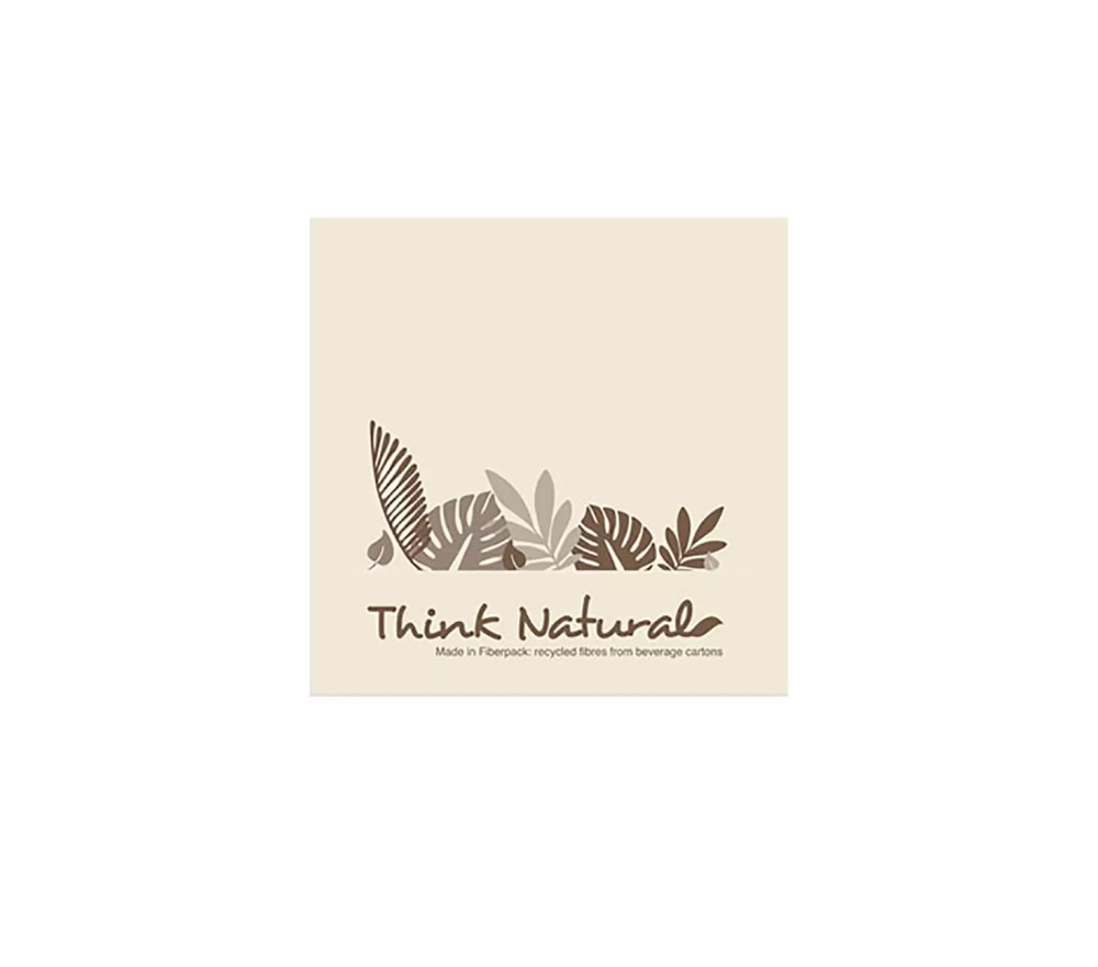 Kétrétegű, natúr, tissue minőségű szalvéta, italoskarton dobozok újrafelhasznált alapanyagából készül.
